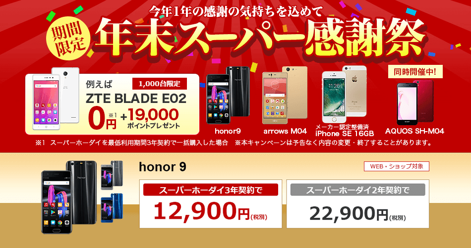 楽天モバイル、スーパーホーダイ契約が条件の「年末スーパー感謝祭」を開始。honor 9、iPhone SE、SH-M04などが対象。