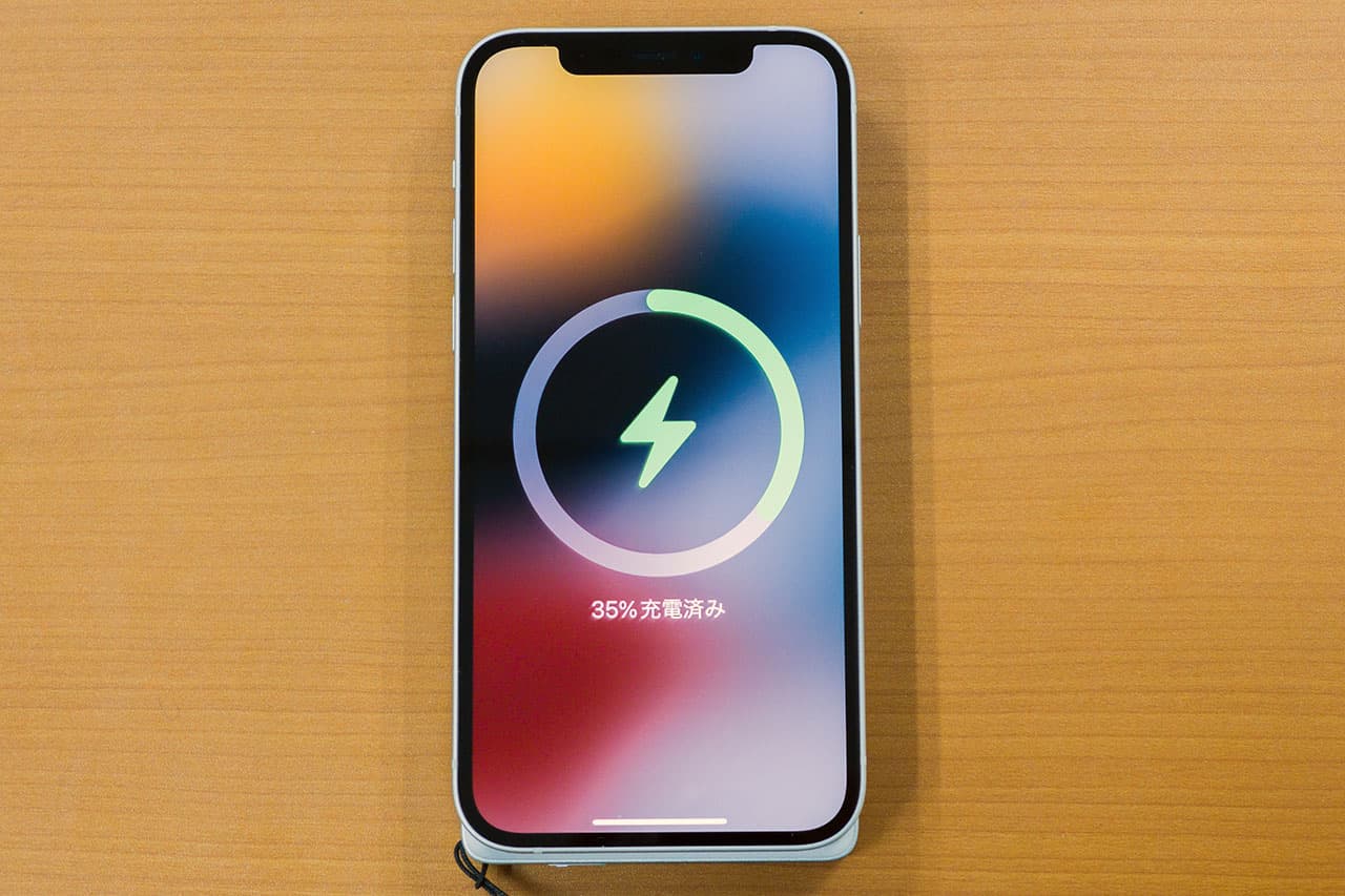 Magsafeで貼り付けるだけで充電が開始されました。iOS 17.4以降のiPhone 12ならQi2による15Wワイヤレス充電ができるんだとか。アップルの認証を受けていない製品でも、7.5Wの出力ではなく15Wの速度で充電できます。