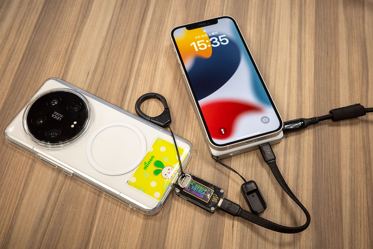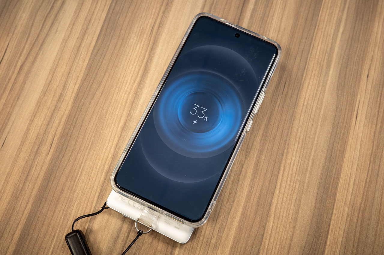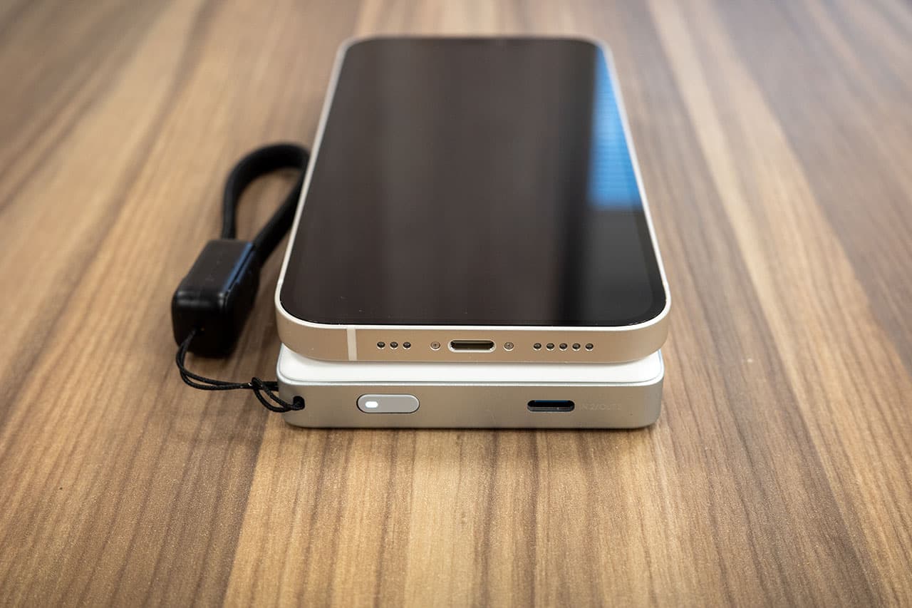 最大15Wでワイヤレス充電が行えるほか、USB Type-Cポートから最大30Wの有線接続にも対応しています。ストラップ一体型のUSB Type-Cケーブルが付属しており、バッテリー本体とケーブルを一緒に持ち運べます。