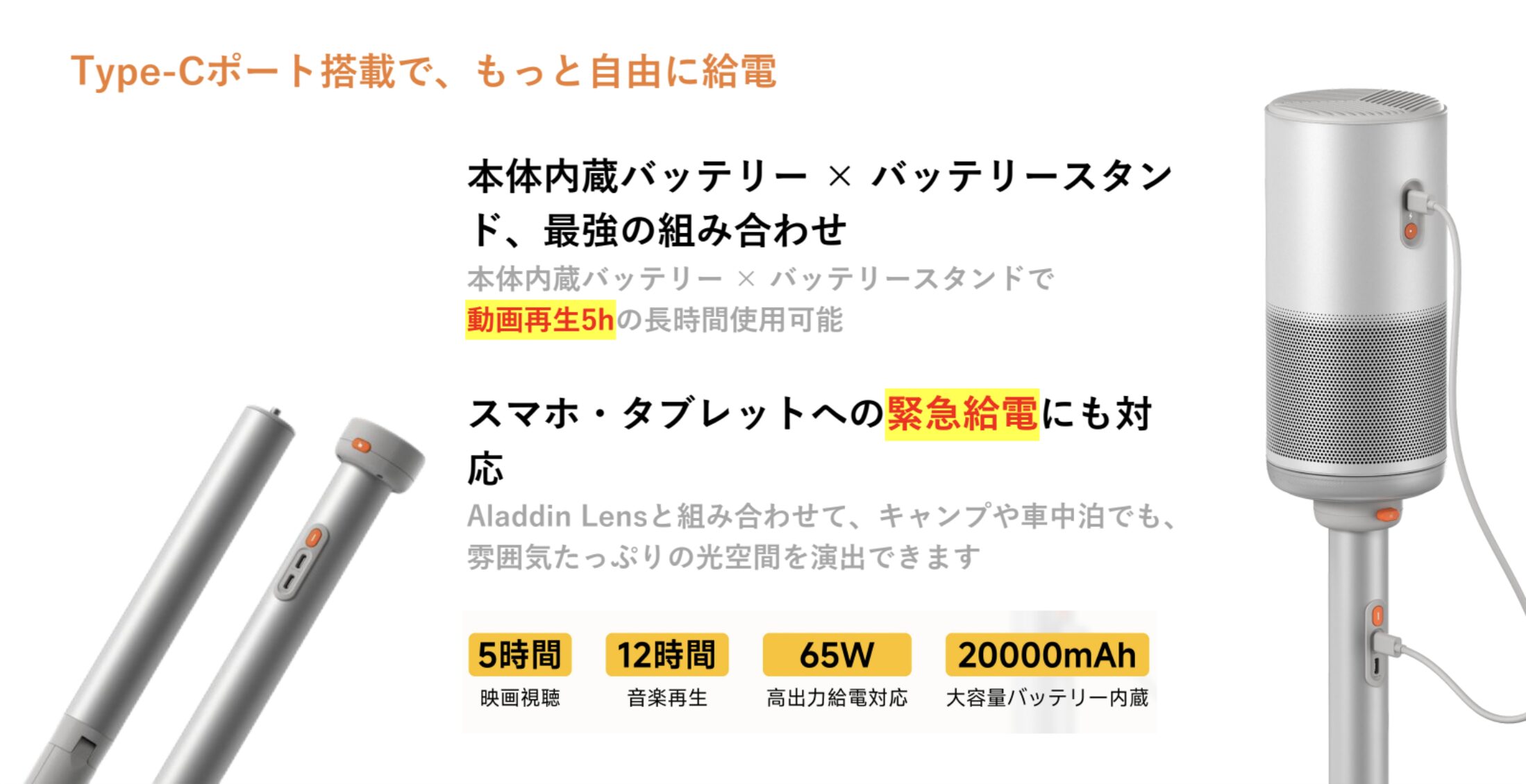 屋外で長時間使用する場合は、専用のバッテリー内蔵スタンドを使用するか、65W以上の高出力に対応したモバイルバッテリー等があると良さそうです。