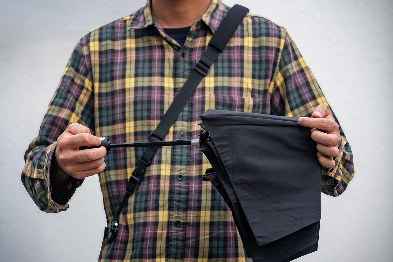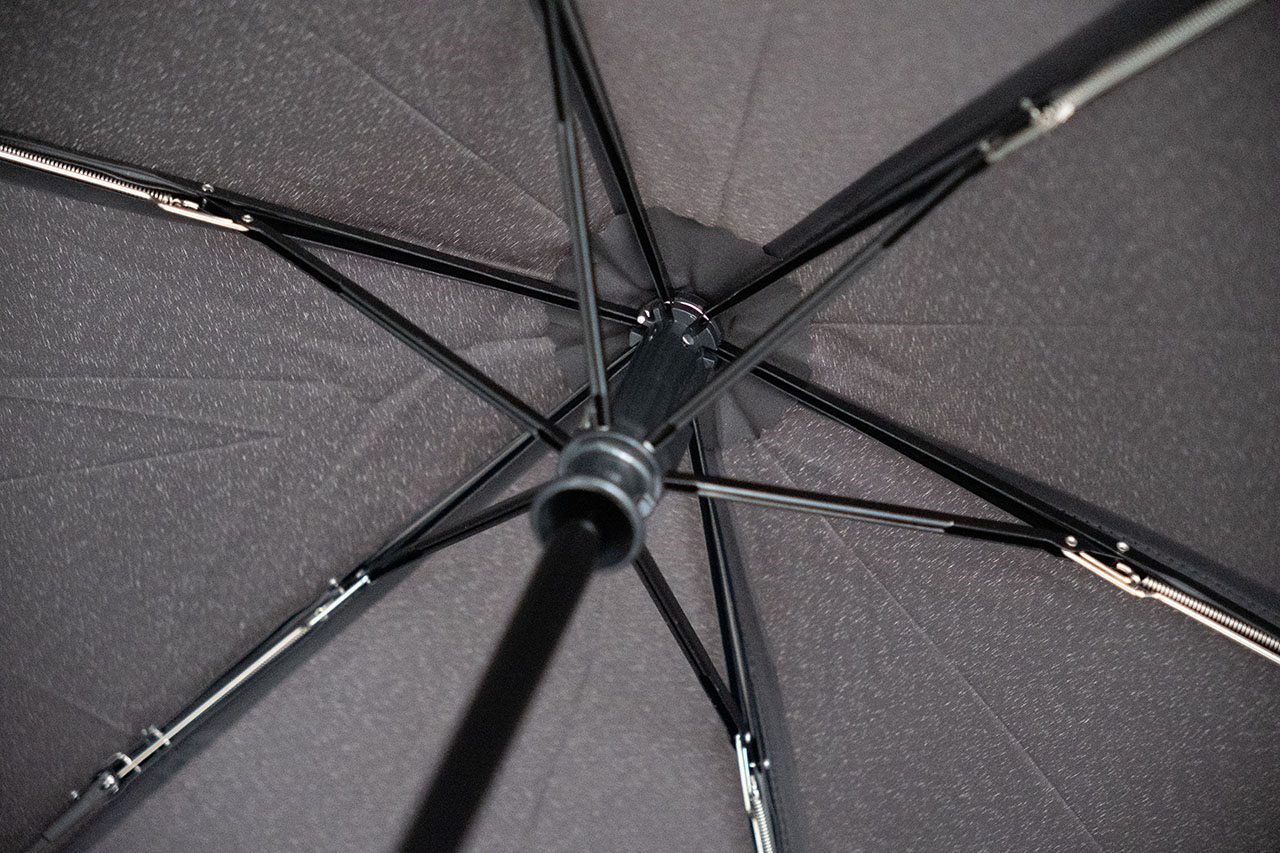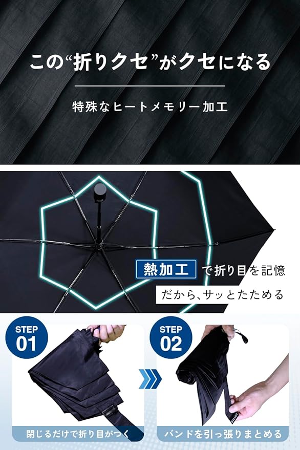 生地に特殊なヒートメモリー加工が施されており、キレイに畳めるように折り目が形状記憶されています。付属の傘袋も大きめで入れやすく、収納時のもどかしさがありません。