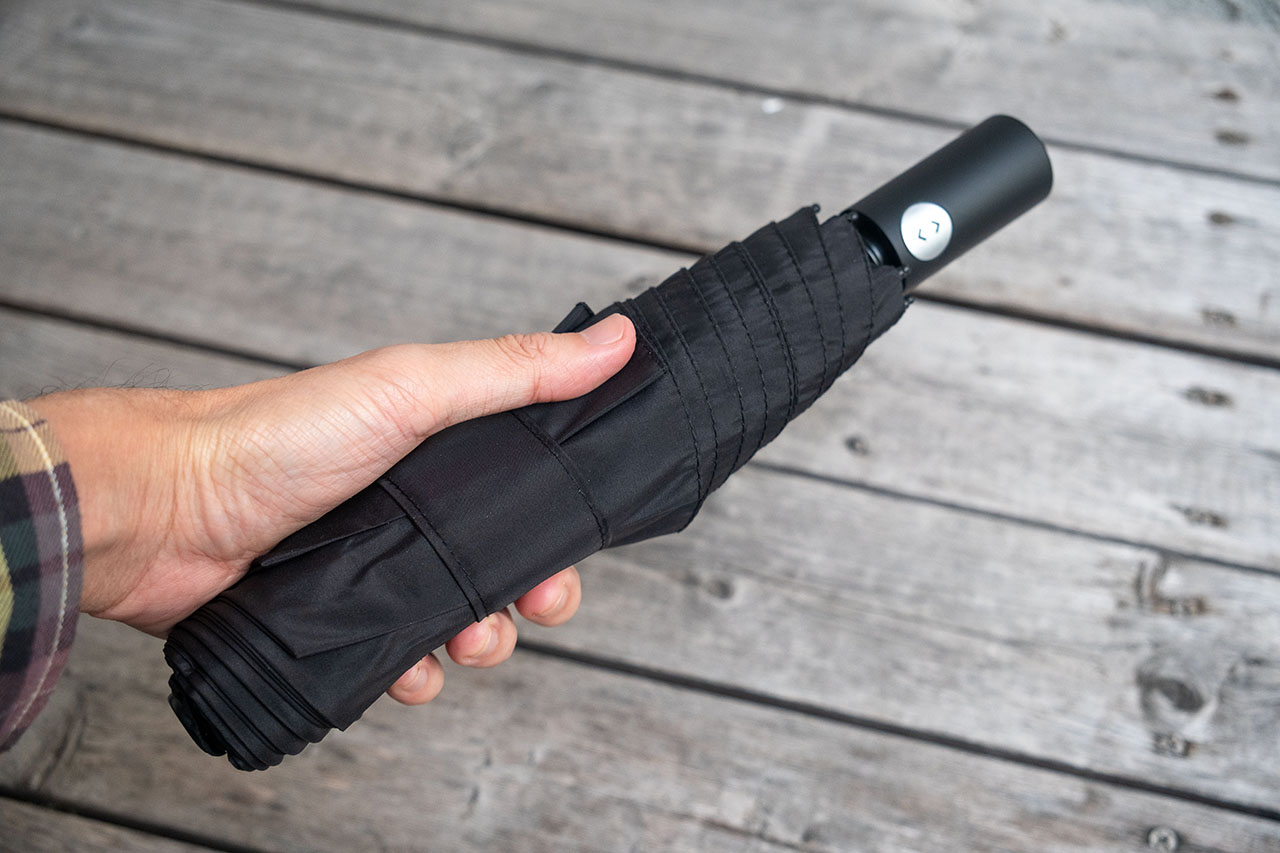 こちらが折りたたみ傘の本体。サイズは28cm×6cmと標準的な大きさで、見た目はよくある折りたたみ傘と何ら変わりません。
