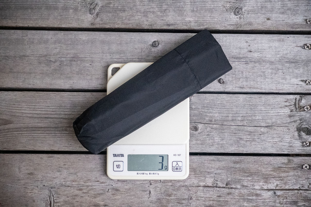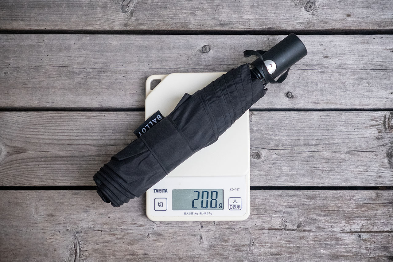 | 重量(実測値) | 本体:208g 傘袋:3g |