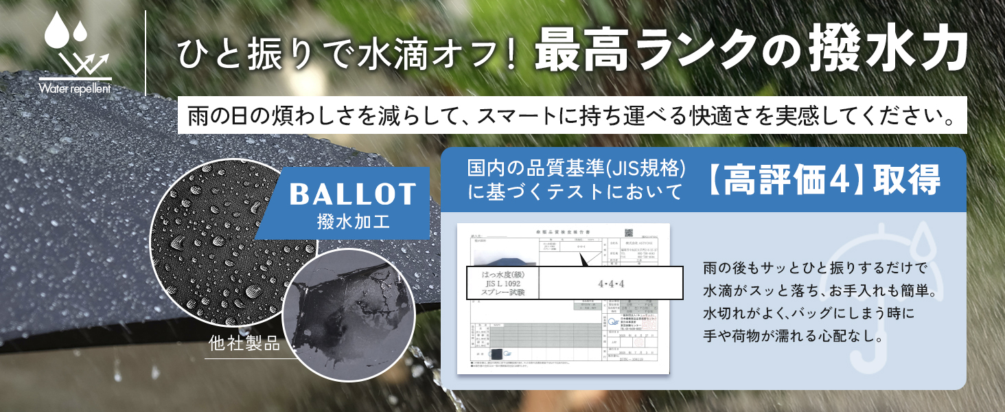 JIS規格の撥水テストで「4級」の評価(上から2個目)を受けているんだとか。水キレが良いのでカバンにすぐ仕舞えるのは便利でした。