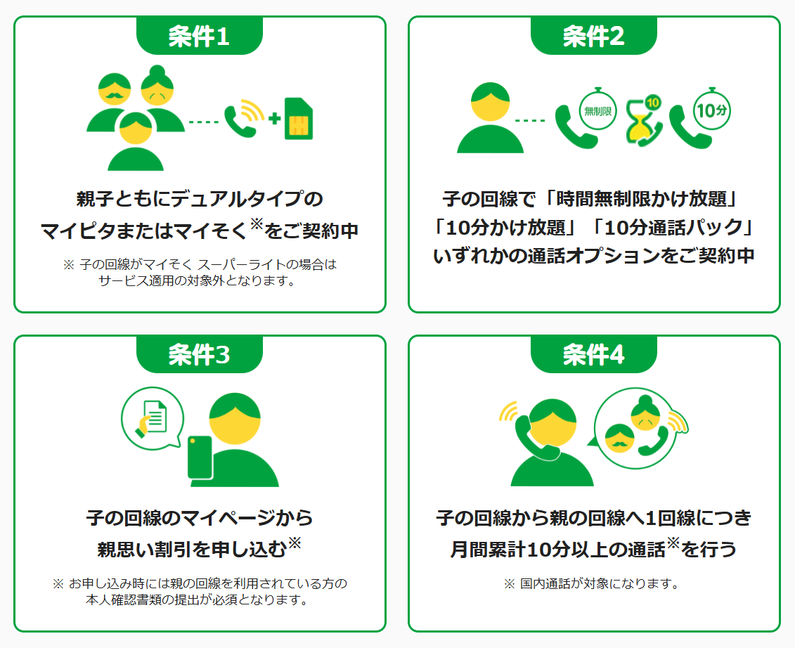 親子ともにデュアルタイプのマイピタorマイそくを利用中で、子どもの回線で指定の通話オプションの契約している方が対象になります。