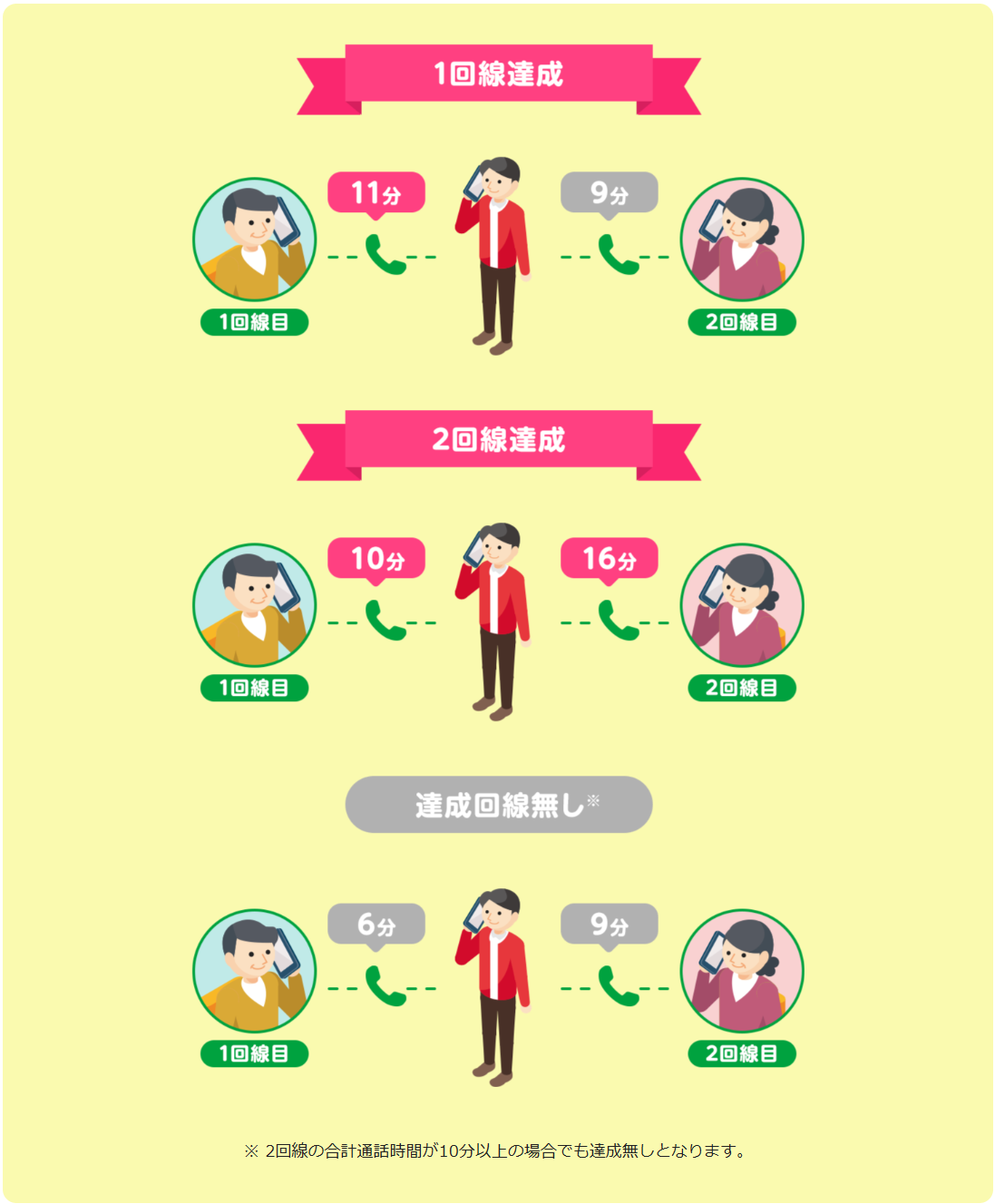 いずれか1回線が累計10分通話を達成した場合は110円の割引、2回線とも達成した場合は220円の割引となります。1回の通話で10分以上通話する必要はありません。