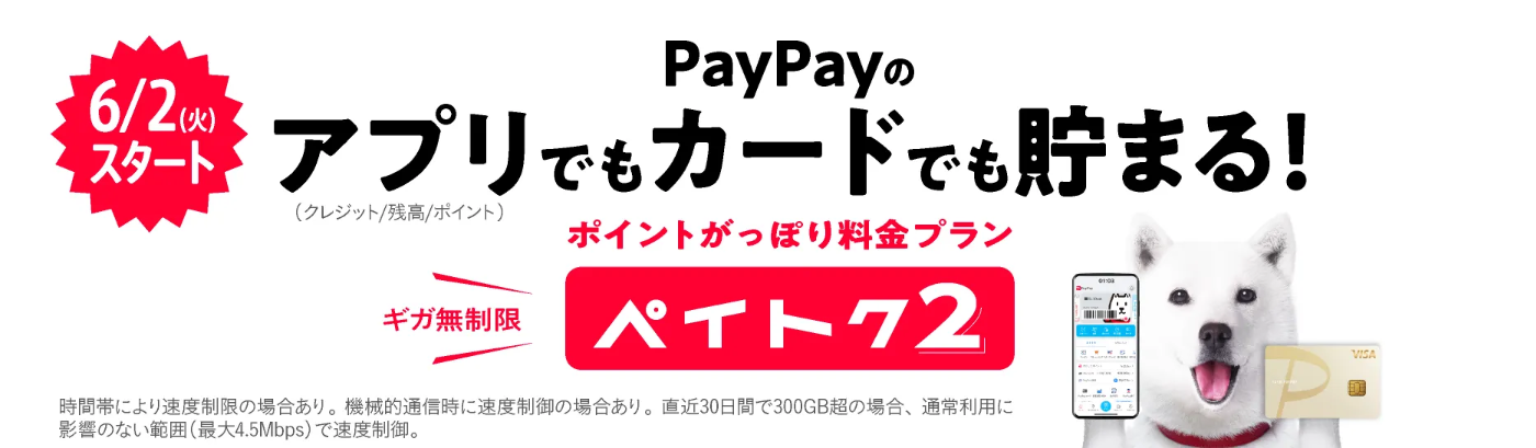ペイトク2は、月間データ容量は無制限のプランで、対象決済時に「ペイトク2特典」でPayPayポイントが貯まります。